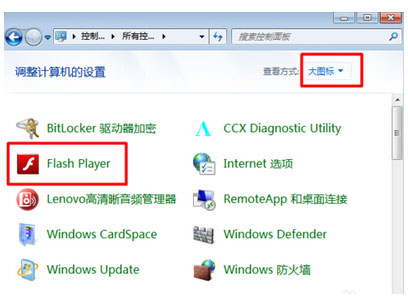 1.打开“控制面板”,将“查看方法”设置为“大图标”,然后点击“FlashPlayer”项进入;