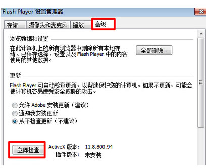 2.在打开的“FlashPlayer设备管理器”窗口中,切换至“高级”选项卡,并点击“立即更新”按钮;